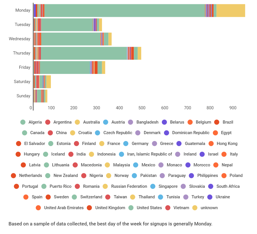 The general data shows that monday has much higher sign-up rates than any other day of the week. Thursday has the next best engagement rate, but with nearly half as many users. According to our data, you may want to focus your sales efforts to the beginning and middle of the week to see the most conversions. Try it out and let us know if you notice big changes.