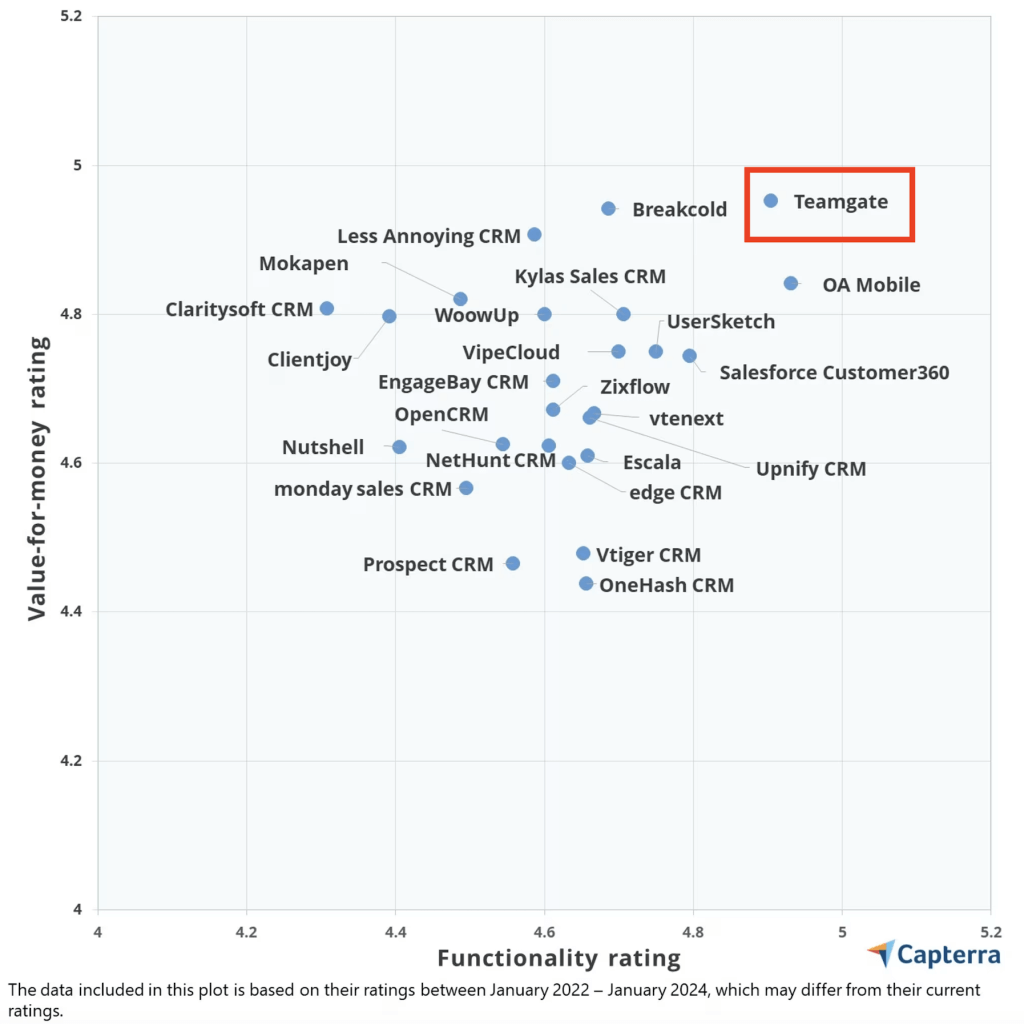 Teamgate is proudly recognized by Capterra in the Capterra Value Report: A Price Comparison Guide for CRM Software, which highlights the top CRM software products for functionality and value-for-money.