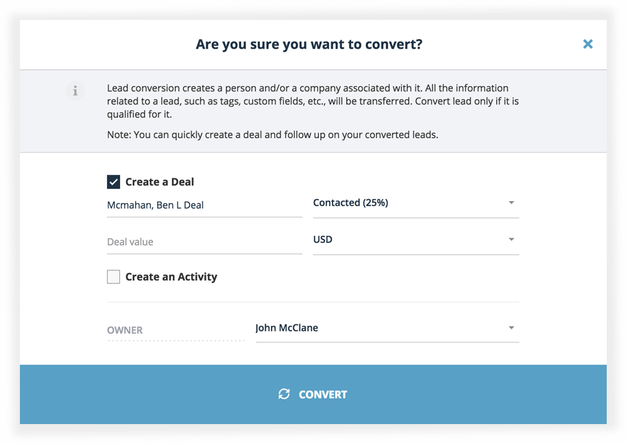 When a lead qualifies – from being merely interested, to being a fully qualified prospect – you may then convert that lead into a New Business Opportunity (Deal). All the communication history associated with that lead will then be transferred to a deal’s card automatically, meaning no lost information, no lost communications, and no lost time, in the process. Another great range of tools and features at the heart of your lead management solutions.